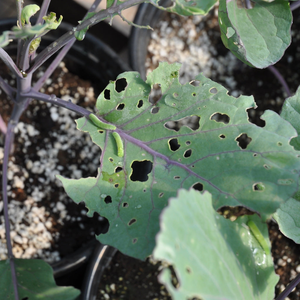 There are in fact two types of cabbage moth in North America, one native and one introduced from Europe. Both overwinter in soil, even in cold climates, and the emerging adult butterflies lay tiny yellow eggs on the undersides of brassica plants; these go on to hatch into the green worms that cause the damage. The pressure on plants increases as the season goes on, as multiple generations reproduce and the time required for each life cycle decreases in warmer weather. The worms are easy to spot on flat or open brassicas such as kale, while they will burrow into broccoli or cauliflower heads, making a mess of things and potentially surprising your dinner guests!