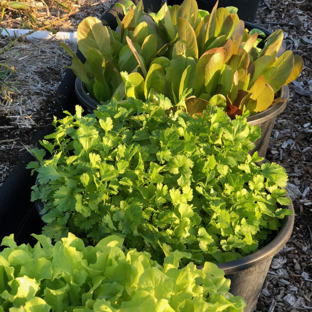 These pots are set to be planted on August 13, 2022. We'll be harvesting from them right into October without any special protection from cold (some exceptions would be tender herbs, like basil, which last until frost).