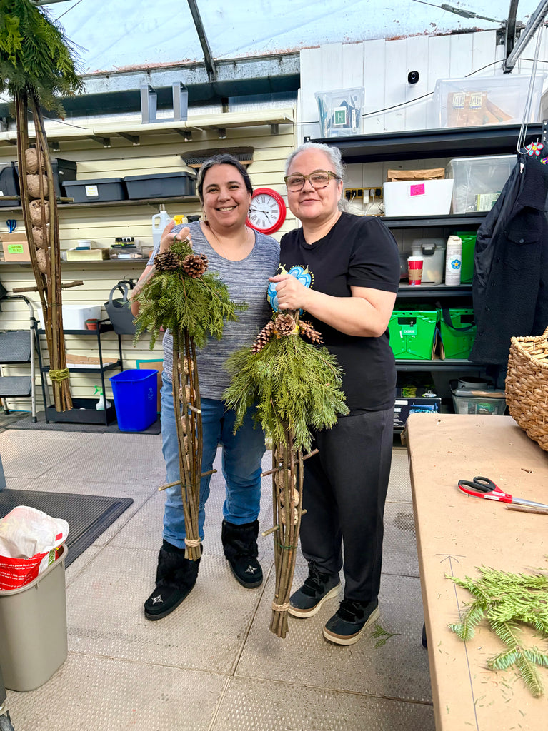 All materials including wildcrafted willow and local evergreens, plus natural adornments and the suet balls are bundled into the workshop.