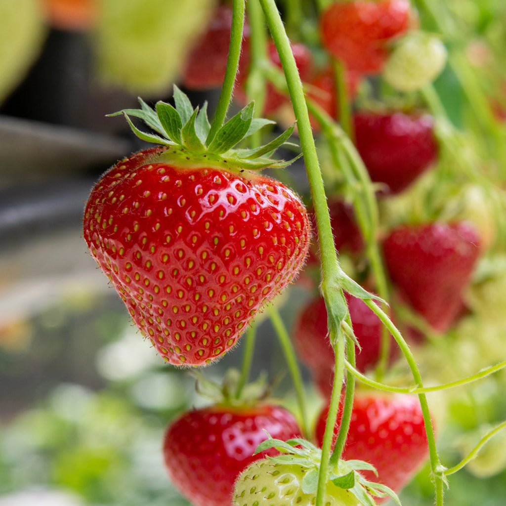 Description: You'll love harvesting plump, tasty berries from July into fall... but don't over look how beautiful this strawberry is, with deep red flowers! We love combining this style of strawberry with herbs and edible flowers in mixed pots. Or, go for the gusto and and create a straight up huge hanging basket just dedicated to the berries! Either way, Ruby Ann brings both the thriller and spiller personality in containers.